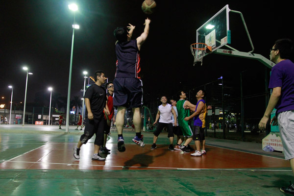 這是一個揮灑汗水與激情的角斗場,籃球撞擊地面發出擲地有聲的蓬勃“心跳”,是這里有力的律動節拍。閃亮的燈光下,穿梭著奔跑、跳動的身影。對手的奮力“廝殺”,對友的強強聯手,讓每一場角逐都精彩好看;進球時歡呼雀躍,失手時捶胸頓足,讓每一個人都熱情真實;舉手投足、嬉笑“怒罵”中更無形拉近了這些熱血男兒的心;上班時交流甚少的同事,下班后在這里“打成一片”,在“心跳”的節拍下共同“戰斗”。