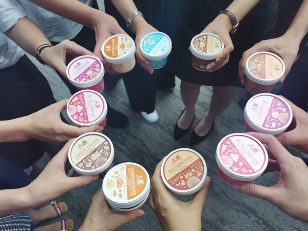 接著,伴隨著熟悉的生日歌旋律,“祝你生日快樂……”,壽星們面對燭光搖曳的蛋糕,共同許下生日愿望。雅雯代表壽星分切芒果千層蛋糕,大家舉起冰淇淋“干杯”擺造型,享用著甜美的蛋糕,每人還獲得一個生日禮物——小按摩器。